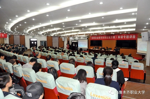 4月28日上午,我校在新校区举行学习贯彻落实《国家职业教育改革实施方案》精神专题讲座。学校特邀全国职业教育集团化办学工作专家组成员、教育部职业技术教育中心研究所评估中心副主任周凤华作专题报告。乌鲁木齐市人民政府副市长、市委教育工委副书记、市教育局局长赵黎,自治区教育厅职业教育与成人处副处长阿不来提·托合提出席,自治区第三产业(现代服务业)职教园区成员单位、乌鲁木齐职教集团成员单位共304人聆听报告,报告会由校党委书记李长江主持。