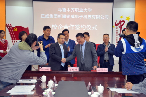 仪式上,学校党委副书记、校长艾尼玩·伊布拉音与正威集团新疆智能终端项目副总裁夏正宏代表校企双方签订协议,校企双方本着“优势互补、资源共享、互惠双赢、共同发展”的原则,达成五方面协议:一是在正威集团挂牌成立“乌鲁木齐职业大学实习实训基地”,为校方提供相关专业学生实习实训场所;二是校方根据企业用工需求,以“订单班”或“冠名班”等方式为企业定向培养人才;三是企业推荐技术与管理骨干到校方担任客座教授、专业带头人和技能名师;四是在校方挂牌成立“正威集团新疆铭威电子科技有限公司培训基地”,承接企业新入职员工岗前培训和在职员工的深造提升培训工作;五是双方积极探索多种形式的混合所有制办学体制机制,深度推进产教融合、校企合作,实现校企无缝对接。