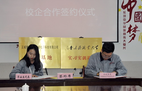 签约仪式现场,乌鲁木齐职业大学经济贸易学院市场营销1615班学生赖旺滢作为毕业生代表与正威集团新疆铭威电子科技有限公司签订用人合同,成为企业一员。