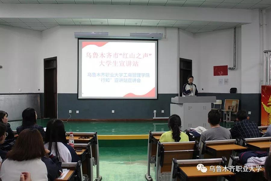 2019年5月22日晚,工商管理学院在新校区A栋教学楼2201合堂组织开展了乌鲁木齐市“红山之声”大学生宣讲站暨工商管理学院“行知”宣讲团宣讲会。工商1709、1701、1702、1805等12个班级代表及结亲老师和各自结亲对象共计113人参加。