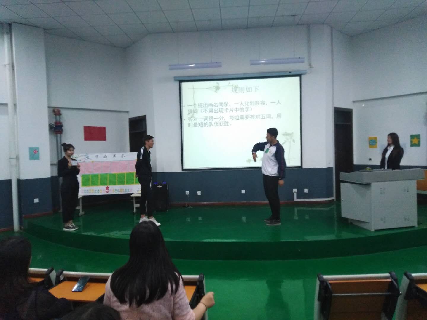 这次竞赛主要由朗读比赛、书法比赛、猜谜语、卡片猜字和一站到底五个环节组成。在答题过程中玉木提江、库德热提等3名同学表现出色,给大家留下了深刻印象;在朗诵比赛中,每位同学用心诵读,阿迪莱同学饱含深情地朗诵了《再别康桥》深深打动了现场师生;在书法比赛中,同学们认真书写着《沁园春·长沙》。学院领导也和同学们一起朗诵,一起互动。