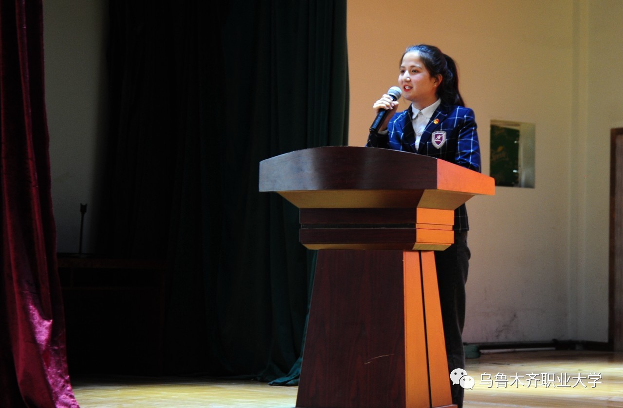 应用工程学院阿孜扎·图尔逊同学引用鲁迅先生说过的“惟有民族之魂是值得宝贵的,惟有它发扬起来,中国才真的有进步”,激励同学们把爱国之志变成报国之行,为振兴中华而勤奋学习。