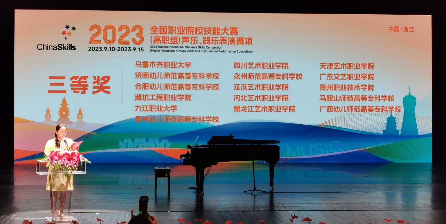 近日,我校艺术学院组建的乌鲁木齐职业大学代表队在2023年全国职业院校技能大赛(高职组)声乐、器乐表演赛项(GZ056)中,喜获团体三等奖第一名(全国排位第17名)的好成绩,这是该赛项在全国首次进行的团体赛制比赛,也是我校艺术学院在全国此项团体赛事中取得的最好成绩。
