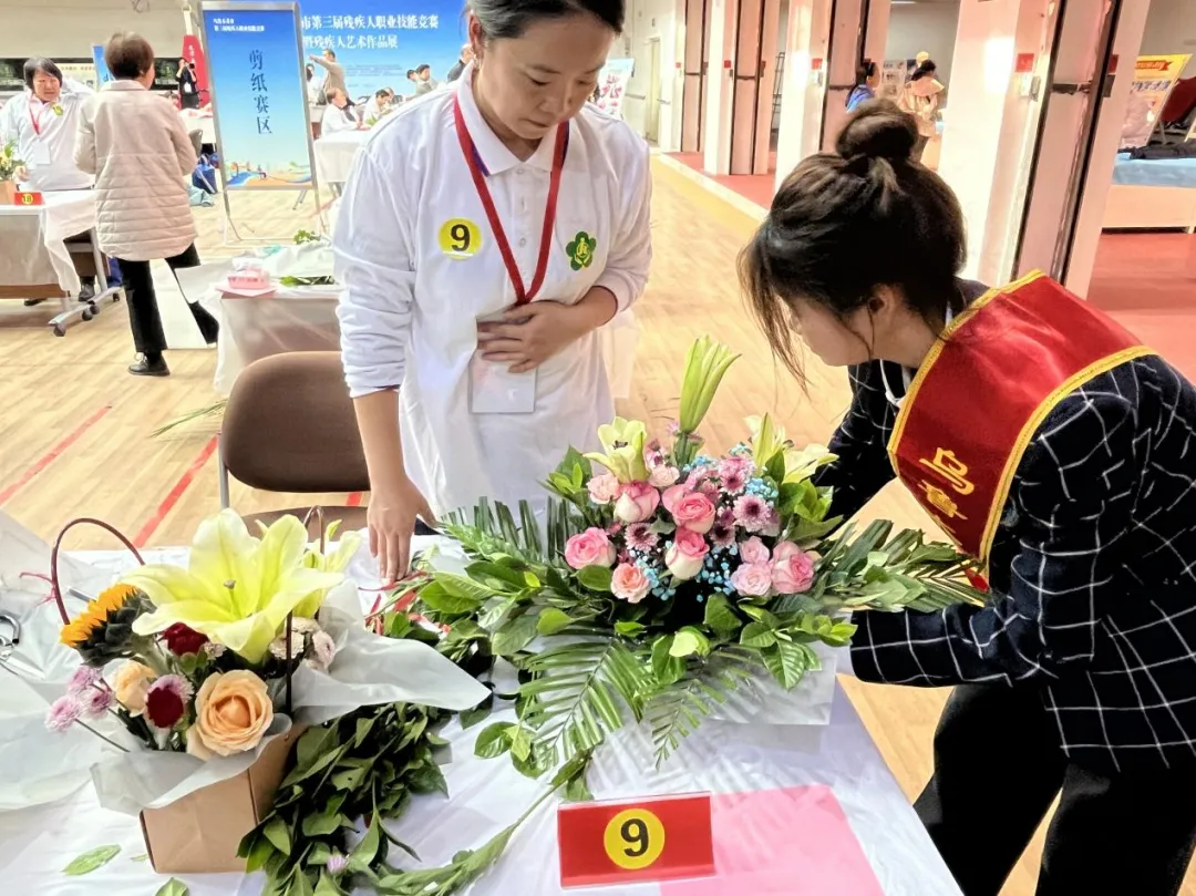 自大赛开始前,志愿者们就投身于各项准备工作中,全程参与联络、接待、布置、参赛引导、设备调试和颁奖等服务。在比赛现场,志愿者们的身影更是无处不在。在盲人保健按摩项目中,他们细心引导盲人参赛选手到达指定位置;在剪纸竞赛中协助参赛选手裁剪纸片、拿取工具;在插花项目中帮助残疾人粘贴胶带、拿取花朵;在新媒体主播的竞赛环节,志愿者们则积极帮助参赛选手调试设备,保证比赛顺利进行。比赛结束后,志愿者们也没有停下忙碌的脚步,迅速投入清理会场的工作中,每位志愿者坚守岗位直到比赛结束。