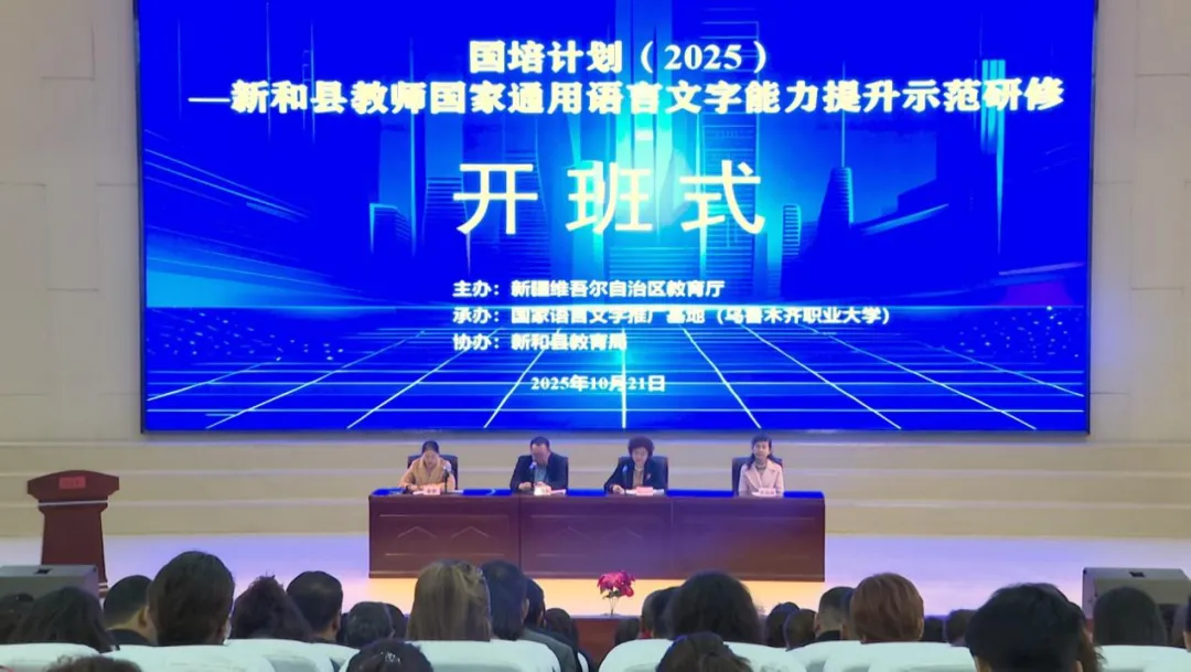 1021日,自治区“国培计划(2025)——教师国家通用语言文字能力提升示范研修”开班式在阿克苏地区新和县丽水小学顺利举行。此次培训班由我校教师培训学院组织申报、国家语言文字推广基地(乌鲁木齐职业大学)承办。开班式由新和县教育局党组成员、副局长曾飘主持。授课团队以及来自新和县各中小学251名学员参加开班式