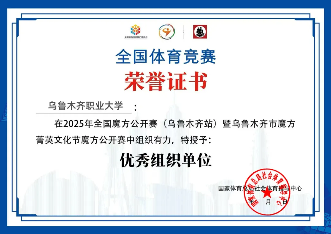 10月25日至26日,“2025年全国魔方公开赛(乌鲁木齐站)暨第一届乌鲁木齐市魔方菁英文化节魔方公开赛”成功举办。我校以专业、高效的服务保障,助力这一国家级赛事顺利开展,凭借突出表现被授予“优秀组织单位”荣誉称号。