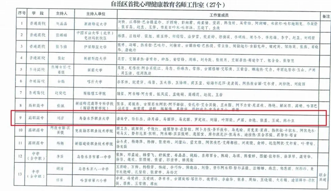 近日,自治区教育厅印发《关于公布自治区第二批思政课、高校辅导员和首批心理健康教育名师工作室遴选结果的通知》,我校再创佳绩!马克思主义学院副院长李黎炜主持的思政课名师工作室获评“自治区第二批思想政治理论课名师工作室”,经济贸易学院教师张燕主持的辅导员名师工作室获评“自治区第二批高校辅导员名师工作室”,学生工作部心理健康教育与咨询中心主任刘彦主持的心理健康教育名师工作室获评“自治区首批心理健康教育名师工作室”。